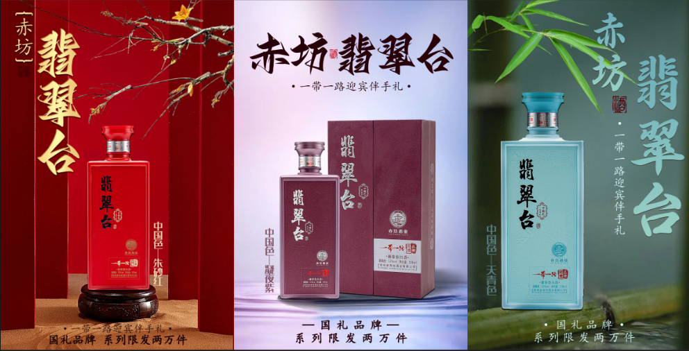 翡翠臺(tái)系列新品共分為朱砂紅、天青色和凝夜紫三種顏色包裝,給消費(fèi)者帶來(lái)傳統(tǒng)白酒與新中式美學(xué)的視覺(jué)體驗(yàn)。“朱砂紅”,正統(tǒng)中國(guó)紅,朱者近赤,視為吉祥的象征,也代表了品牌的衷心祝福,為顧客帶來(lái)吉祥、繁榮和幸福;“天青色”,色彩淺淡柔和、清澈通透、似玉非玉,代表老赤坊酒業(yè)超越、精進(jìn)的品質(zhì),彰顯名門(mén)氣度;“凝夜紫”高端貴氣,紫氣東來(lái),象征老赤坊酒來(lái)自東方,將東方的好送給全球消費(fèi)者。