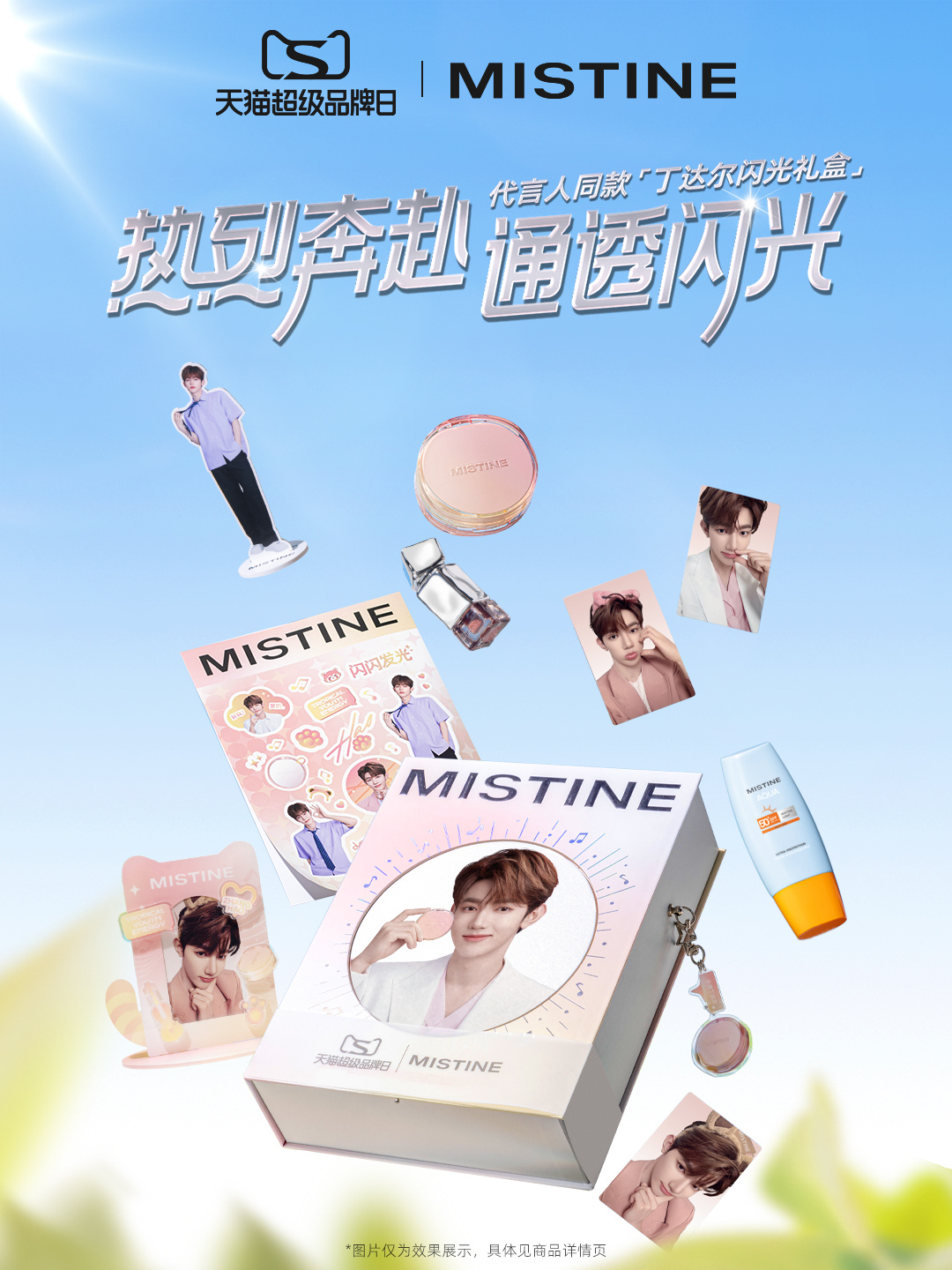 MISTINE 攜手天貓超級(jí)品牌日為新品「冰透丁達(dá)爾」限定系列氣墊打造上新優(yōu)惠,并打造代言人明星周邊、小熊發(fā)箍等禮贈(zèng),拓展 MISTINE 在夏日防曬之外的多元品類,為夏日營(yíng)銷帶來藝人新聲量。