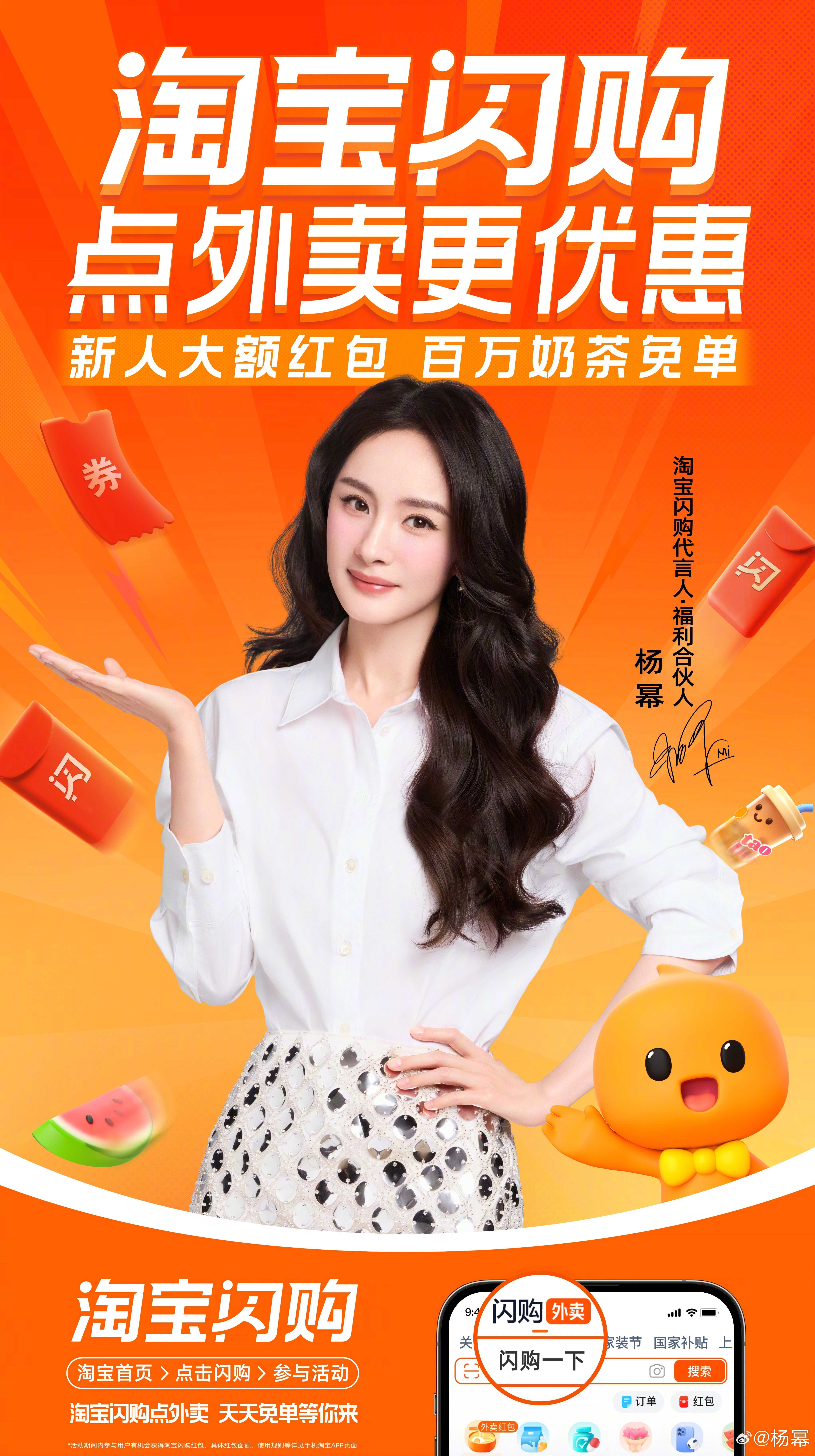 7 月 2 日,淘寶閃購官宣楊冪成為品牌代言人兼福利合伙人,為大家?guī)硪粭l甜「冪冪」的外賣攻略。即日起至 7 月 8 日,用戶上淘寶點擊「閃購」搜索「楊冪送福利」,即有機會領(lǐng)取楊冪專屬免單卡。與此同時,淘寶閃購還官宣李現(xiàn)為品牌代言人,通過組合營銷強化話題效應(yīng)。