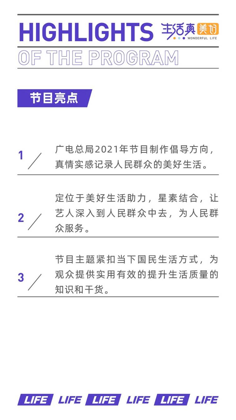 《生活真美好》是湖南即悅文化傳媒有限公司出品的全國首檔聚焦當(dāng)代國民生活,挖掘美好生活方式的互動(dòng)綜藝。節(jié)目于2021年7月16號(hào)晚在湖北衛(wèi)視上線,優(yōu)酷視頻網(wǎng)絡(luò)同步播出。