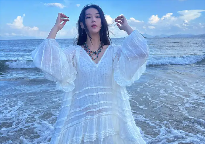 張馨予海邊回眸美艷大方 一身白衣清純動人