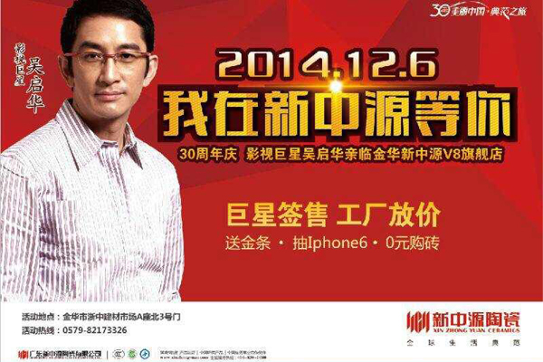 吳啟華出席新中源陶瓷全國巡演5月份行程安排,順演免機票歡迎新老客戶前來預(yù)訂:5月1日:貴州安順5月2日:江蘇徐州5月3日:廣東深圳5月10日:浙江杭州5月17日:四川巴中5月24日:浙江...