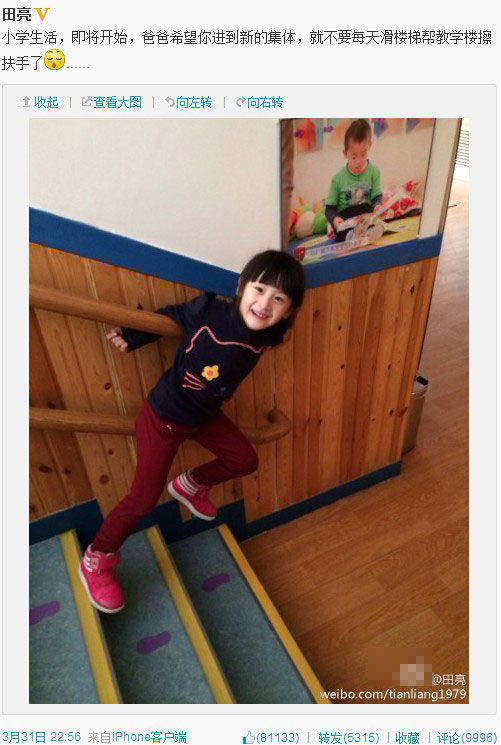 田亮稱cindy將上小學(xué),調(diào)侃不要幫學(xué)校“擦扶手”
