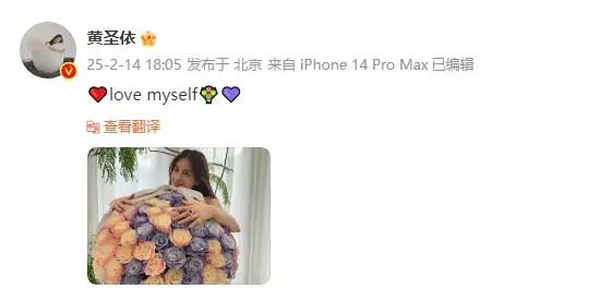 14日,黃圣依(明星經(jīng)紀(jì)公司)在情人節(jié)當(dāng)天曬出一張美照,并配文稱:“愛自己?!闭掌校S圣依戴著心形鉆戒,擁抱著一大束鮮花,笑容滿面,心情大好!