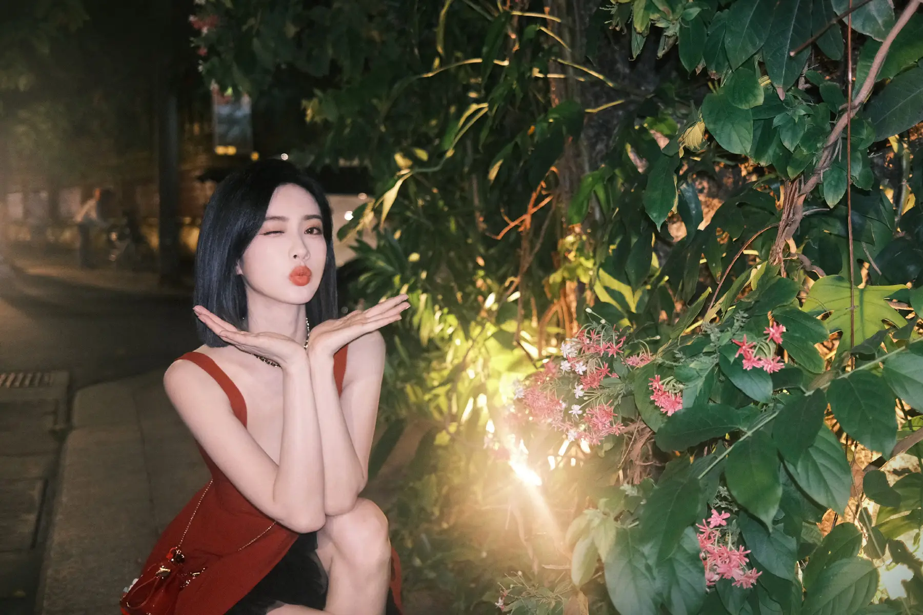 孟子義曬元宵節(jié)營業(yè)美照 穿紅色吊帶裙嘟嘴親親好養(yǎng)眼