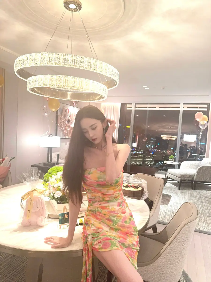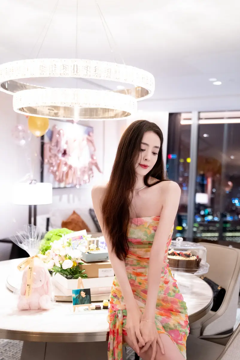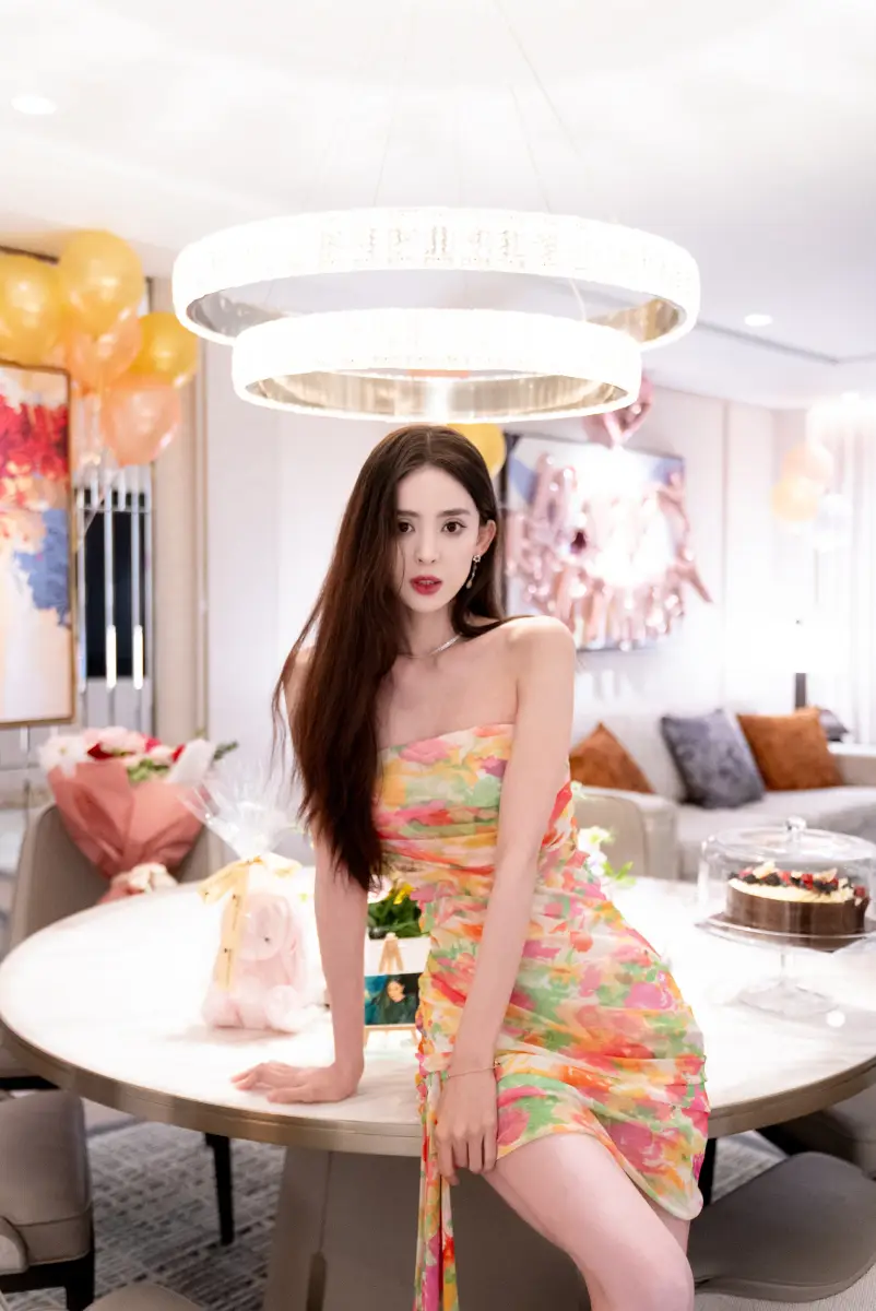 古力娜扎穿彩色抹胸裙凹造型拍美照。