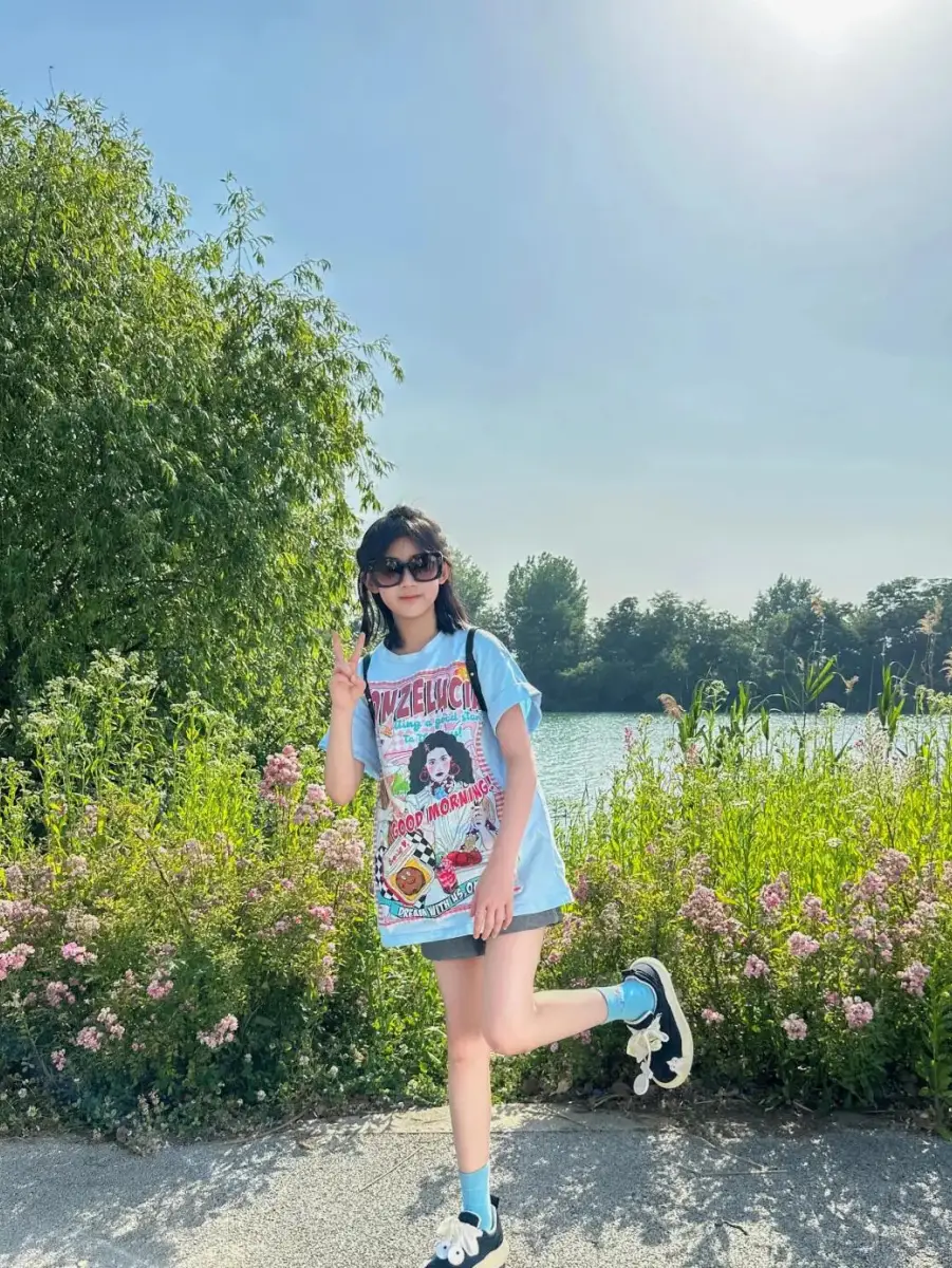 貝兒身穿綠色印花T恤,站在一片花草中,十分清新靚麗。