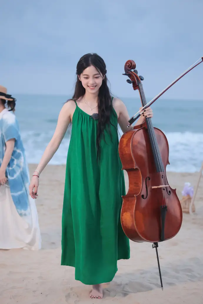 歐陽娜娜穿綠色吊帶裙 海邊拉大提琴文藝優(yōu)雅