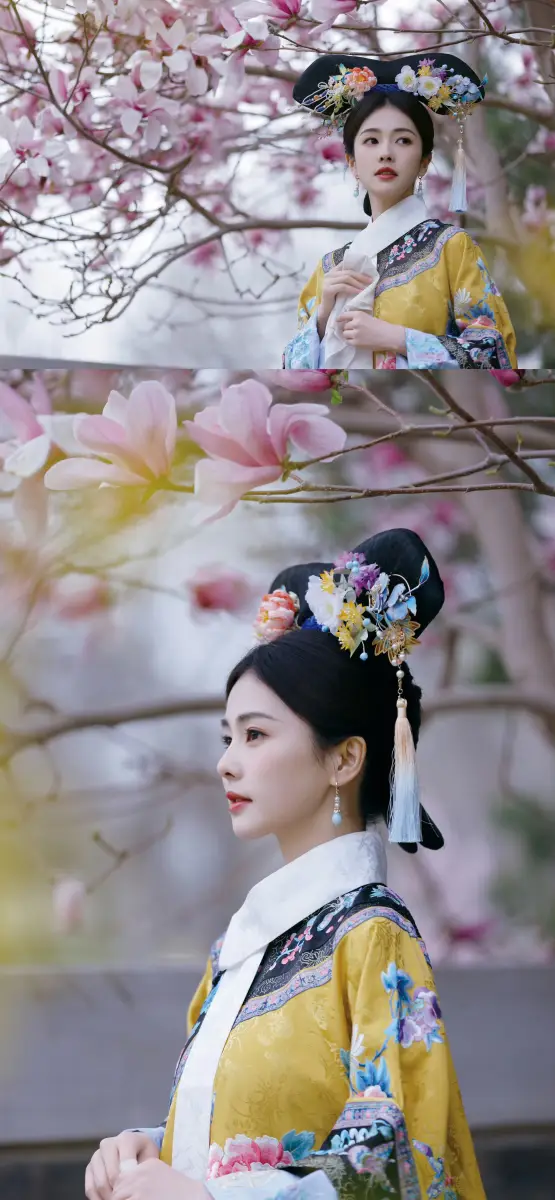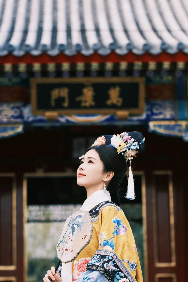 白鹿穿鵝黃旗裝清新明媚 手拿團(tuán)扇眼神純真無瑕