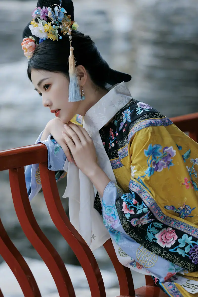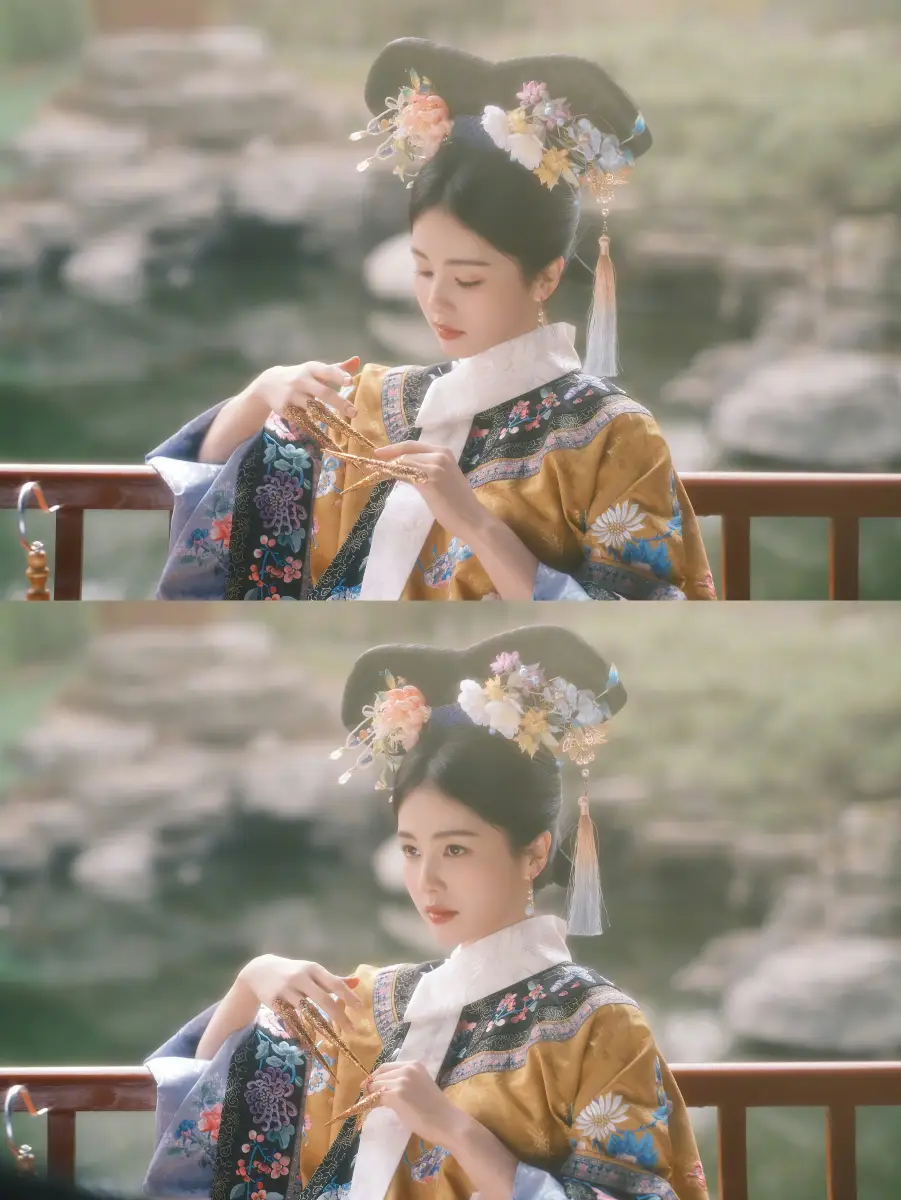 白鹿的旗頭用多種顏色花朵裝飾,富有生機(jī)。