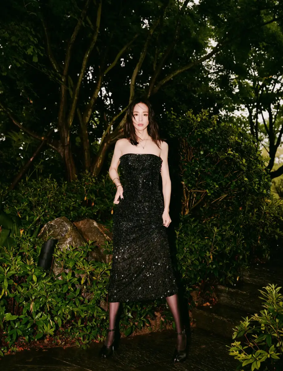 張鈞甯穿黑色兩篇抹胸裙,搭配黑絲和高跟鞋,非常優(yōu)雅。