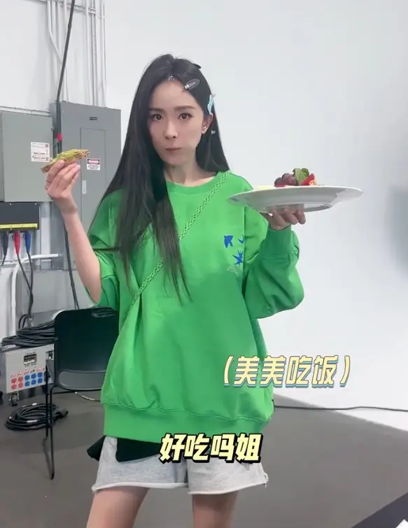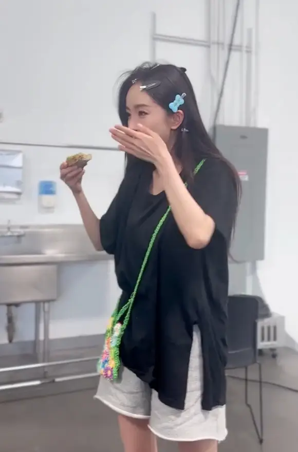 楊冪工作前變身吃貨,大口塞美食。