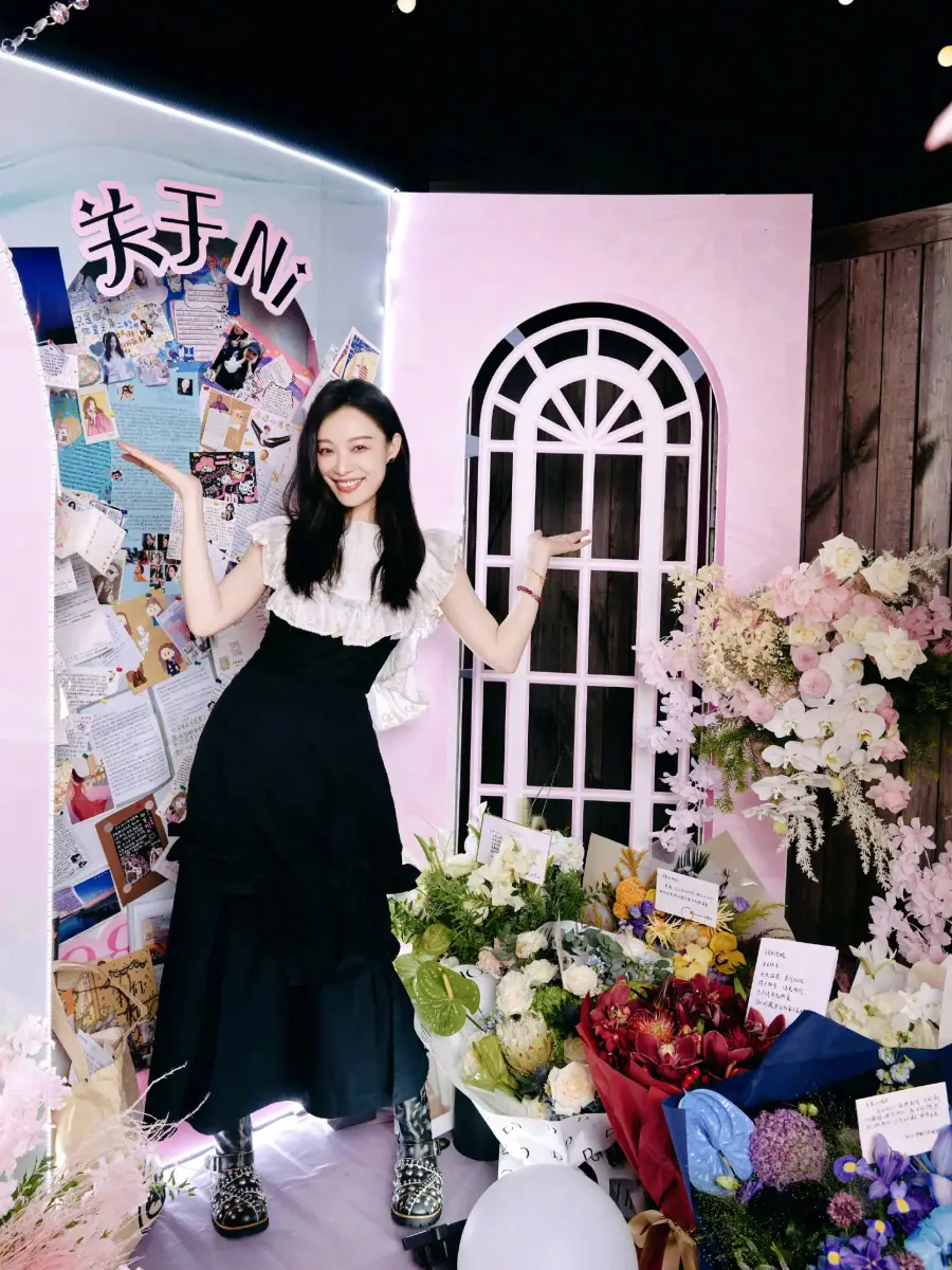 倪妮與生日花墻一起拍照打卡,笑容燦爛眉眼彎彎。