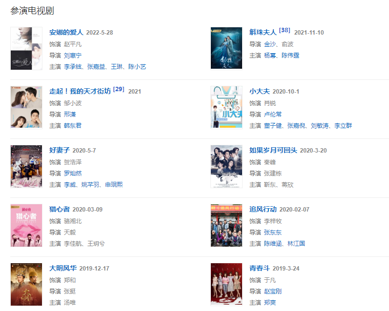 代表作品:倚天屠龍記、如意、因為愛情有多美、把愛帶回家、因為愛情有幸福、秦時麗人明月心