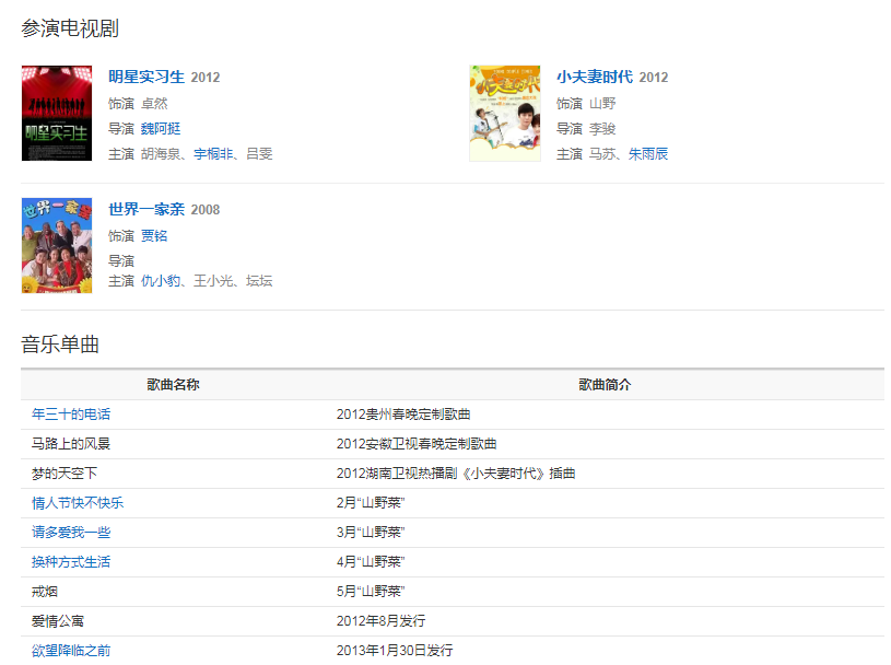 2012年參加浙江衛(wèi)視第一季《中國(guó)好聲音》成為劉歡組學(xué)員,被譽(yù)為“沒(méi)有瑕疵的好聲音” ;同年山野發(fā)起“星光助學(xué)行動(dòng)”巡回公益演唱會(huì),并修建4所星光公益小學(xué);