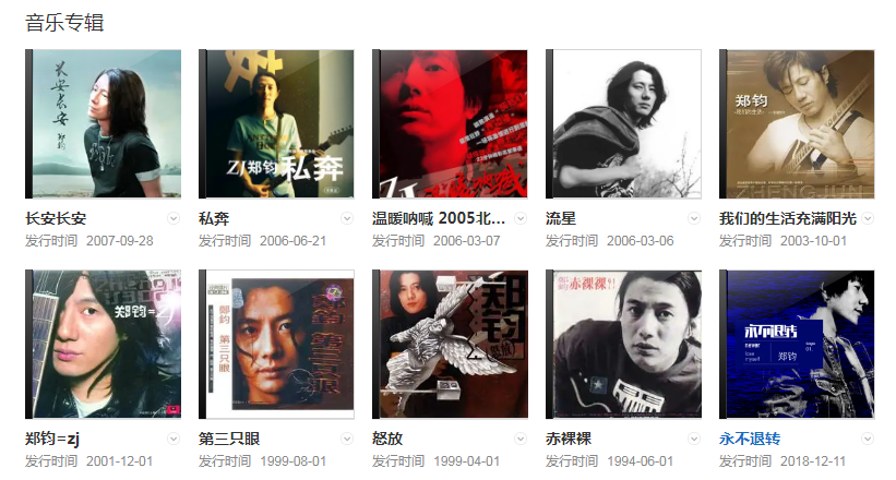 1994年在紅星生產(chǎn)社發(fā)行第一張專輯《赤裸裸》。后又發(fā)行《第三只眼》、《怒放》、《鄭鈞=zj》、《我們的生活充滿陽光》、《長安 長安》等多張專輯。2004年獲得第4屆百事音樂風(fēng)云榜年度最佳搖滾男歌手獎。2013年4月,擔(dān)任湖南衛(wèi)視主推的勵志音樂類真人秀節(jié)目《中國最強(qiáng)音》的音樂導(dǎo)師(與羅大佑、陳奕迅、章子怡)。