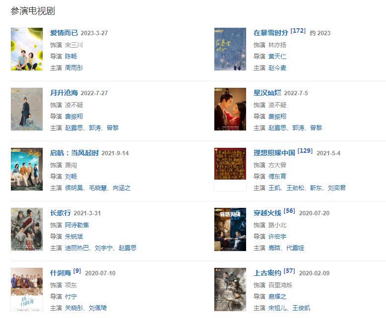 代表作品:旋風少女、瑯琊榜、長歌行、穿越火線、仙劍客棧、影、沙海、盛夏未來、家有外星人、淘氣包馬小跳