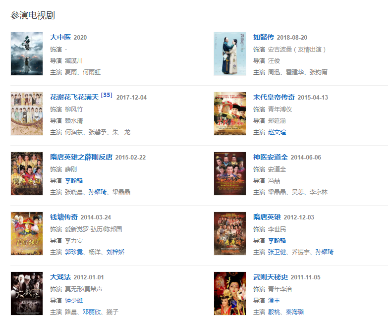 代表作品:梅蘭芳、倩女幽魂、武則天秘史、蒼穹之昴、大戲法