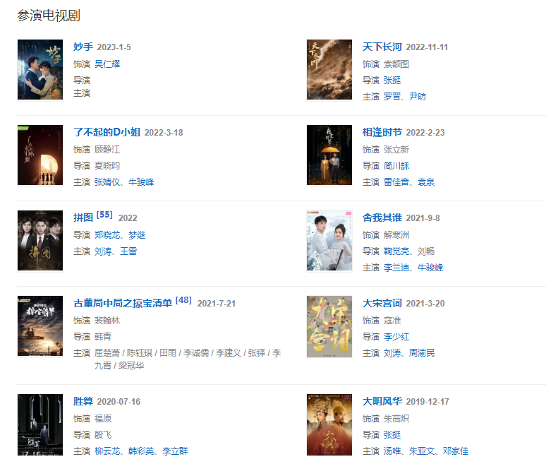 代表作品:貧嘴張大民的幸福生活、神探狄仁杰、美麗的家、渴望、大宋奇案、二馬、紅白喜事、星火、古玩