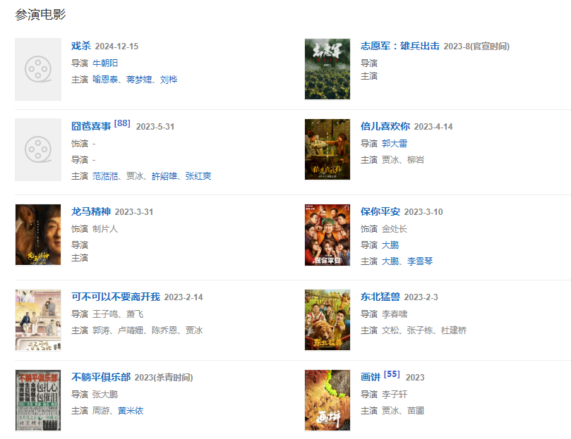 2022314日消息,賈冰主演的電影《保你平安》曝預(yù)告定檔429日;318日,主演的古裝輕喜劇《醫(yī)是醫(yī) 二是二》上線;2022年,參演電影《小妞“嫁”到》;參演電影《臥鼠藏蟲(chóng)》播出。