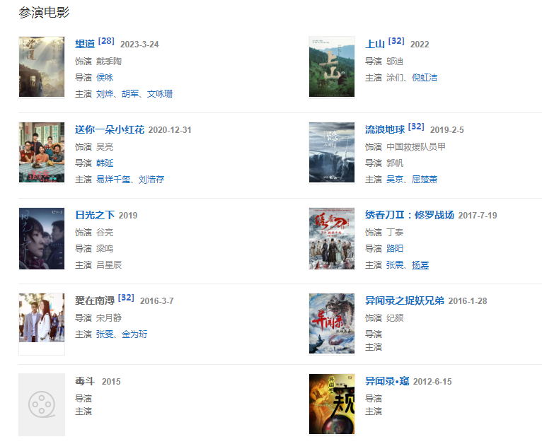 代表作品:青春期、攤開你的地圖、風(fēng)車、長安十二時辰、繡春刀Ⅱ:修羅戰(zhàn)場、日光之下