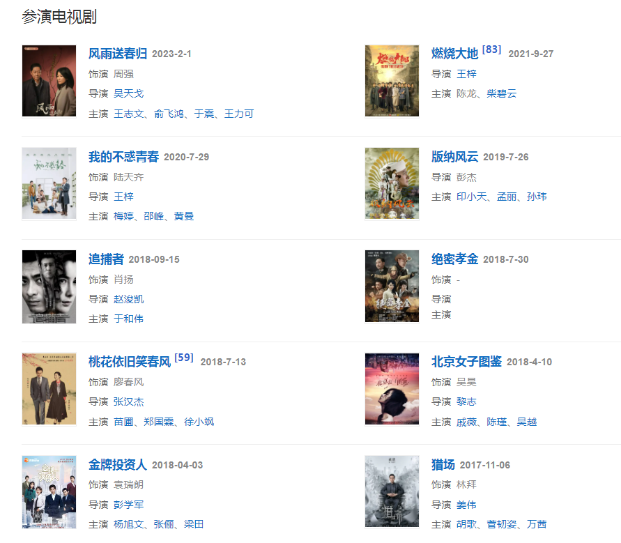 2016年領銜主演原創(chuàng)懸疑話劇《藏骨人》。2017年主演反腐劇《紀委書記》;4月主演近代傳奇劇《桃花依舊笑春風》;11月主演職場劇《獵場》播出。