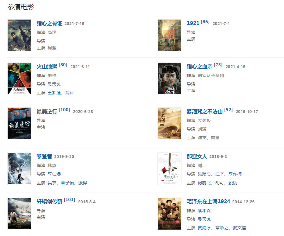 2021年4月16日,主演的刑偵破案電影《獵心之血親》,在片中飾演刑警隊長高翔;6月11日,領銜主演電影《火山地獄》上映;7月16日,主演的懸疑網(wǎng)絡電影《獵心之骨證》在西瓜視頻獨家上線,在片中飾演刑警高翔。9月27日,參演的電視劇《燃燒大地》在山東衛(wèi)視和安徽衛(wèi)視晚間黃金檔同步播出,網(wǎng)絡平臺由芒果TV獨家播出; 參演電影《1921》。