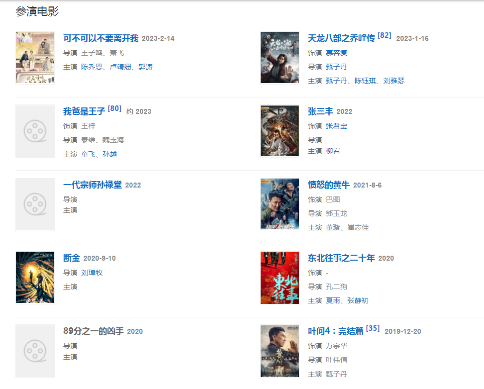 代表作品:地下交通站、西游記、浪子燕青、連城訣、寒戰(zhàn)2、建軍大業(yè)、狂獸、英雄本色4、葉問4:完結(jié)篇