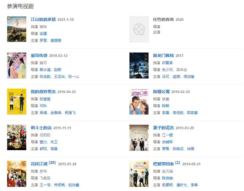 代表作品:妻子的謊言、我的奇妙男友、花樣江湖、真正男子漢第二季