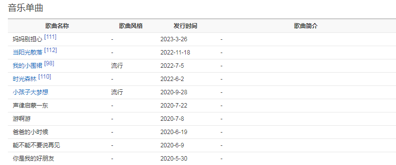 2022年1月,參演《春晚有心意——2021我要上春晚》。與空軍藍(lán)天幼兒藝術(shù)團(tuán)、李夢瀟、宋秉洋、鄧見超,聯(lián)唱兒時金曲。1月17日,發(fā)行單曲《蝸牛與黃鸝鳥》 1月26日,發(fā)行單曲《幸福派送》2月15日,發(fā)行單曲《北方有星辰》3月26日,發(fā)行單曲《魔法棒》。2022年6月2日發(fā)行單曲《時光森林》。2022年7月5日發(fā)行單曲《我的小圍裙》。