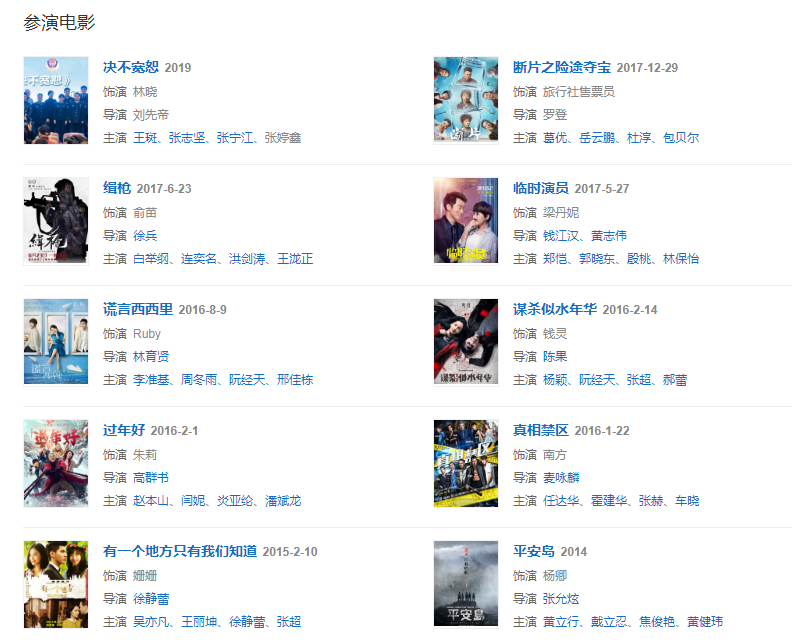 2015年1月,出演愛情電影《謊言西西里》 ;4月,在懸疑動作電影《真相禁區(qū)》中飾演童話作家南方。