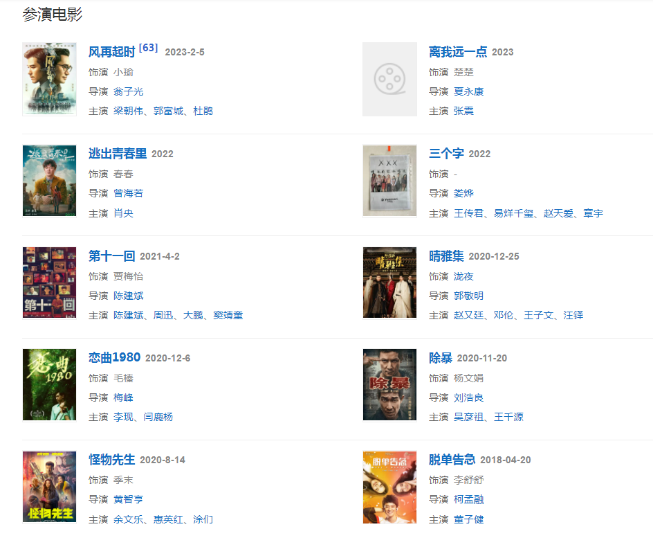 2023年1月21日,參加《2023年中央廣播電視總臺春節(jié)聯(lián)歡晚會》,出演微電影《我和我的春晚》;2月5日,特別演出的電影《風(fēng)再起時》上映。