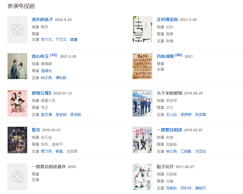 代表作品:新還珠格格、花非花霧非霧、傾城絕戀、班淑傳奇、新婚公寓、一路繁花相送、兵臨棋下、新京華煙云