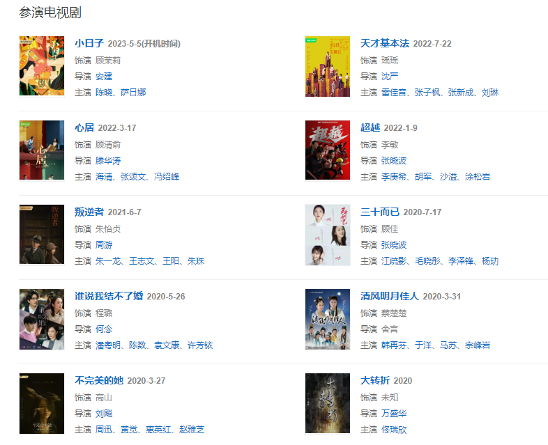 代表作品:大江大河、如懿傳、定制幸福、民兵葛二蛋、新閨蜜時代、三十而已