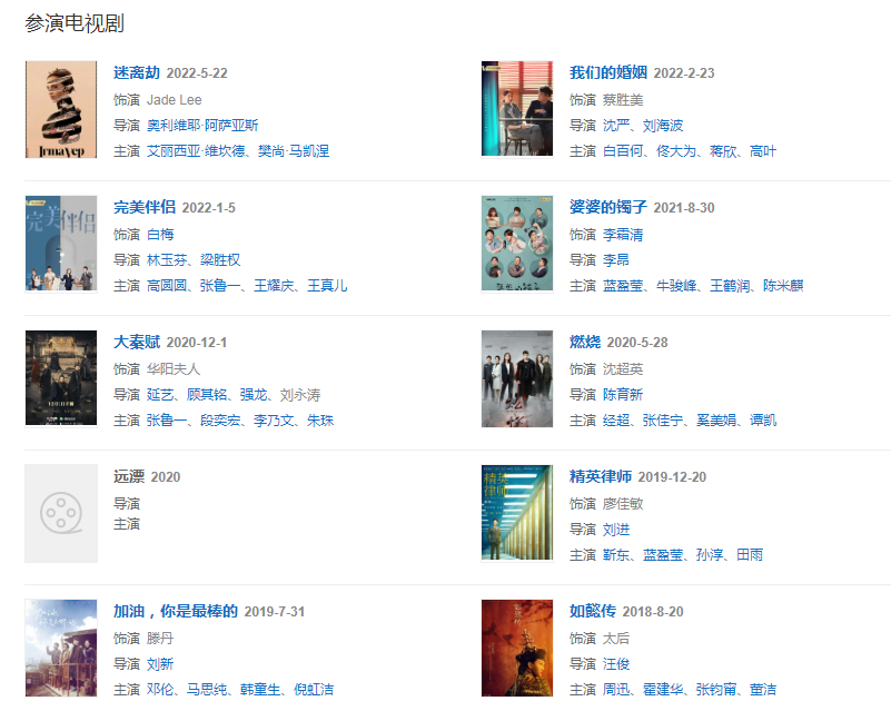 代表作品:蝸居、枕邊書、末代皇帝、宋家皇朝、玫瑰漩渦、辣媽正傳、六人晚餐、上海紅美麗、如懿傳、加油,你是最棒的、精英律師、建國大業(yè)