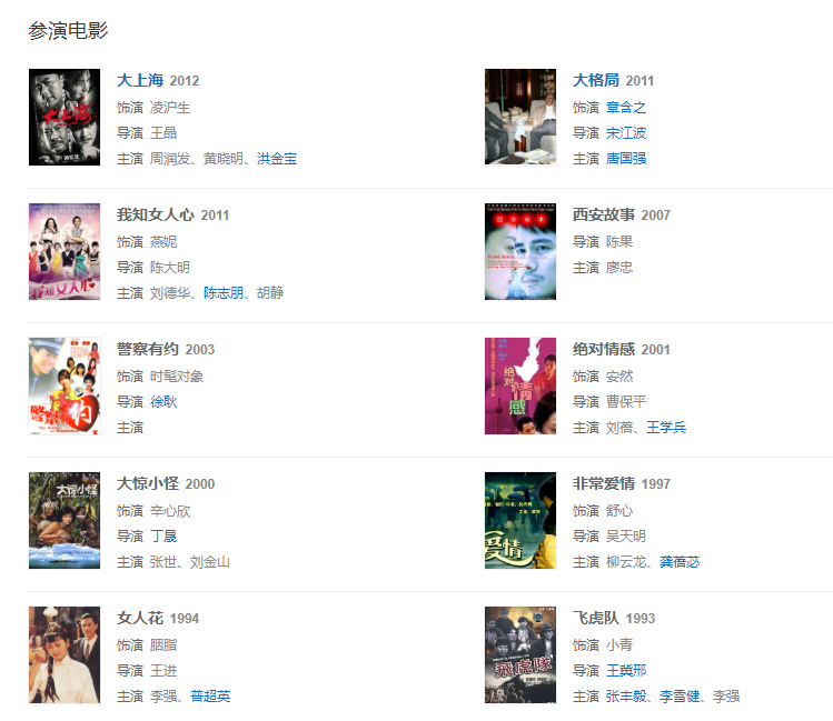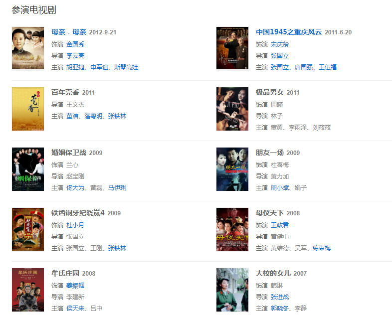 代表作品:母儀天下、牟氏莊園、永不瞑目、啼笑因緣、家在洹上、母親,母親、鐵齒銅牙紀曉嵐、大上海