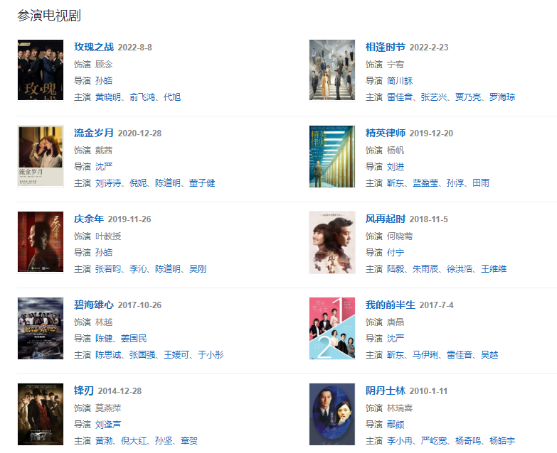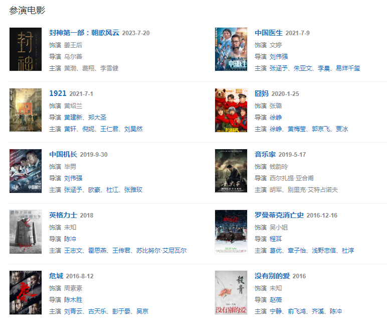 代表作品:美麗的大腳、如夢、小魚兒與花無缺、我的前半生、大上海、后會無期、掃毒、鋒刃、中國機(jī)長、琥珀、中國醫(yī)生、孤獨(dú)的花朵