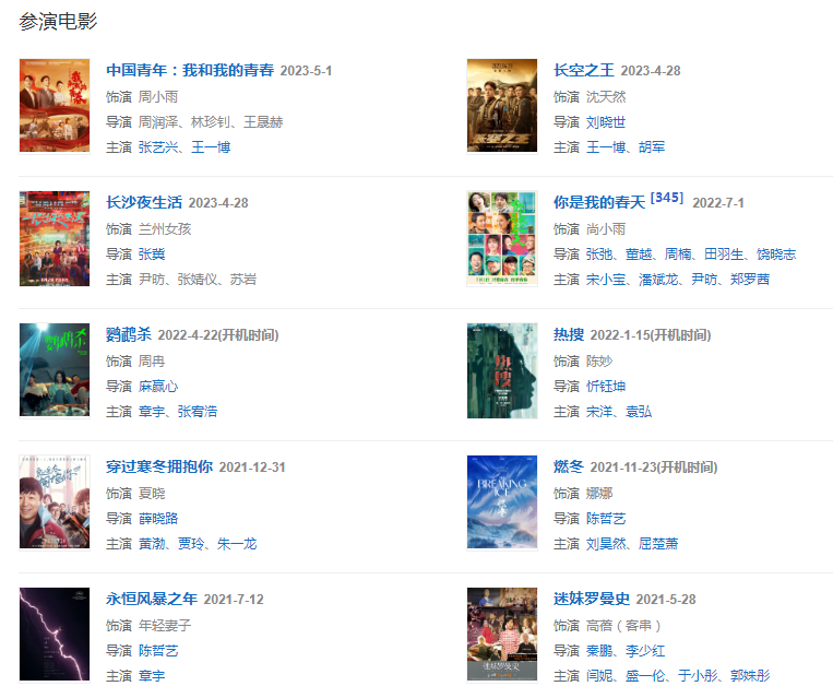 20221月,在文化類(lèi)綜藝節(jié)目《朗讀者第三季》中朗讀《小敘事》;同年,參加《百花迎春》晚會(huì),與靳東、吳京等人共同講述《致百花》。同年,與劉昊然、屈楚蕭主演的電影《燃冬》  ;317日,為電影《你是我的春天》獻(xiàn)唱的主題曲《想看你笑的樣子》發(fā)布;同年,主演由陳道明擔(dān)任總策劃、黃渤擔(dān)任監(jiān)制的抗疫電影《你是我的春天》;4月,參演的電影《熱搜》殺青。422日,與章宇、張宥浩領(lǐng)銜主演的電影《鸚鵡殺》宣布開(kāi)機(jī)。2022年,周冬雨參演獻(xiàn)禮“二十大”影片《中國(guó)青年:我和我的青春》(暫定名);523日,參加紀(jì)念毛澤東同志《在延安文藝座談會(huì)上的講話(huà)》發(fā)表八十周年暨慶祝大眾電影百花獎(jiǎng)創(chuàng)立六十周年特別節(jié)目。
