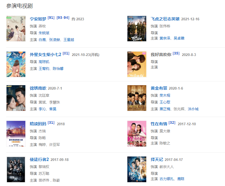 2020主演電視劇《黃金有罪》、《我好喜歡你》 、《錦繡南歌》等。