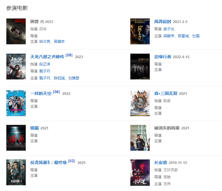 代表作品:黃金十年、邊城浪子、天地男兒、廉政追緝令、倚天屠龍記、大塊頭有大智慧、柔道龍虎榜、北上廣不相信眼淚