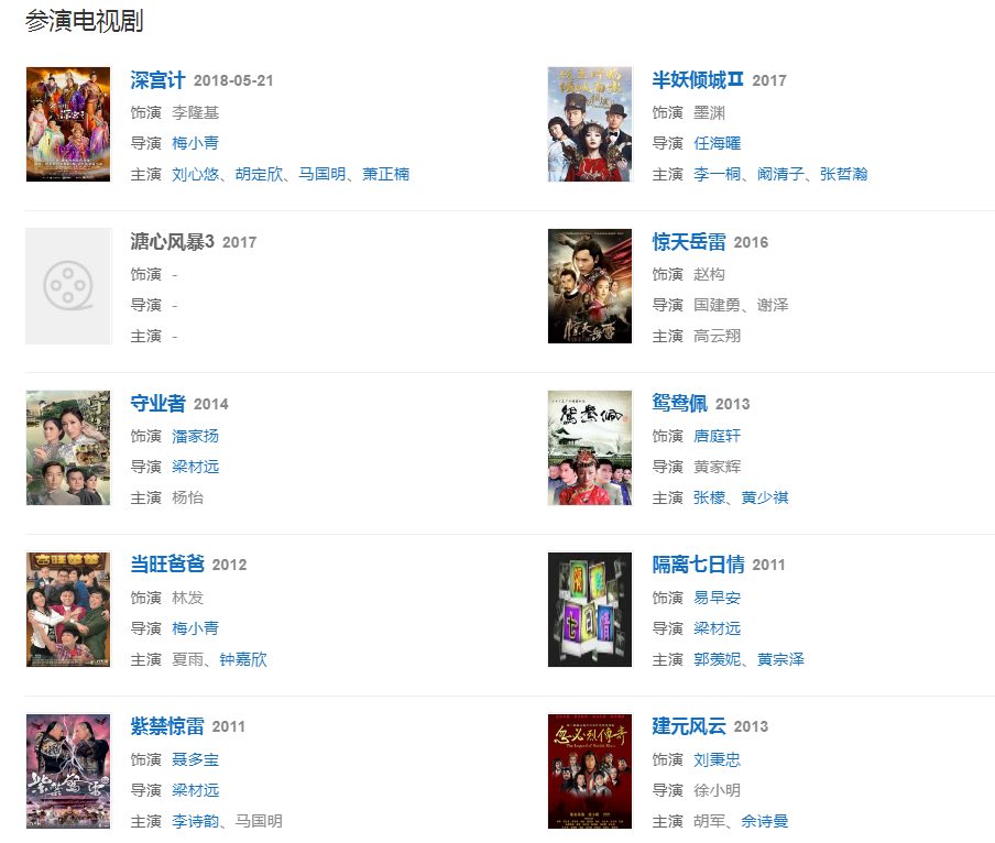 代表作品:鹿鼎記、洛神、突圍行動、隔離七日情、鐵血保鏢、誘情轉(zhuǎn)駁、偶然·徐志摩