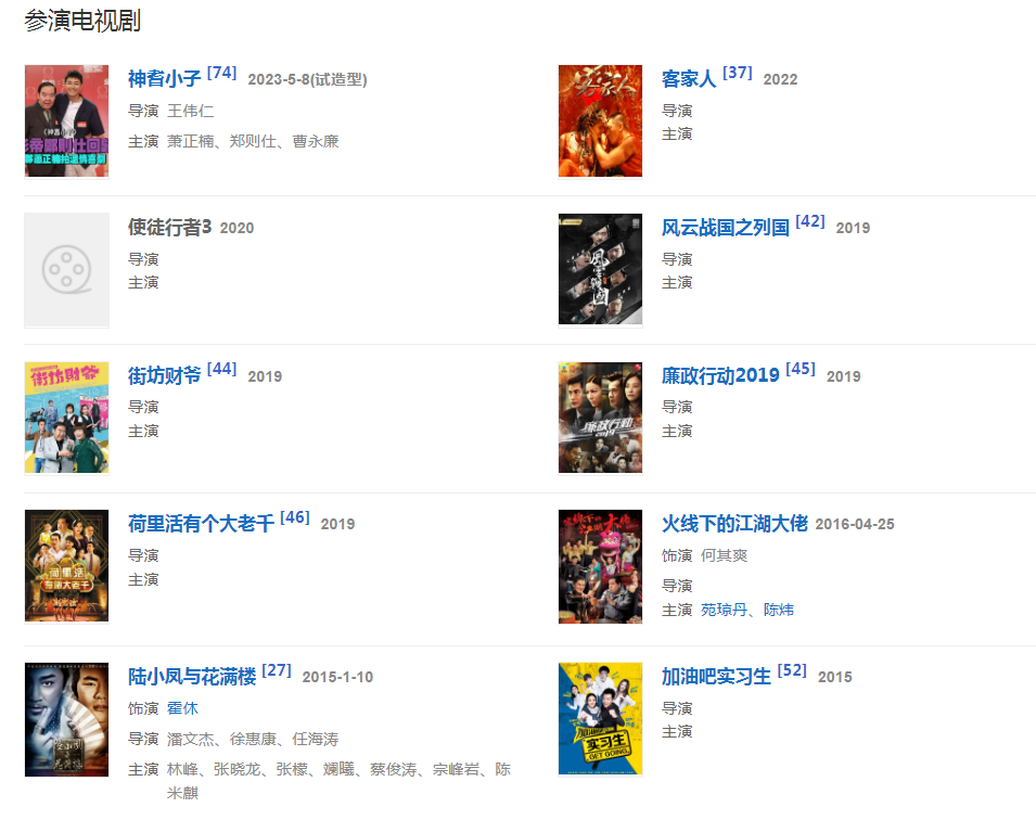 2019年12月11日,其出演的劇情式歷史紀(jì)錄片《風(fēng)云戰(zhàn)國之列國》開播;同年,主演劇集《荷里活有個(gè)大老千》和《街坊財(cái)爺》;同年,客串《廉政行動2019》。